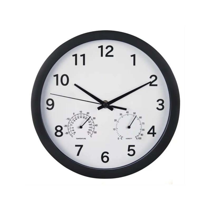 - nástenné hodiny s analógovým zobrazením času, teploty a vlhkosti vzduchu v miestnosti - plynulý pohyb sekundovej ručičky pre tichý chod bez hlasného tikania - veľký biely ciferník s čiernymi arabskými číslicami - hodinová, minútová a sekundová ručička - rozsah merania teploty: -30°C až +50°C - rozsah merania vlhkosti: 0% až 100% - rozmery (priemer x hĺbka): 25 x 4 cm - hmotnosť: 420 g - napájanie: 1 AA Mignon batéria (súčasť balenia) - materiál obruby/krytu: plast/sklo - farba obruby/ciferníku: čierna/biela - balenie: papierová krabička s certifikovaným pôvodom dreva, bez obsahu plastov